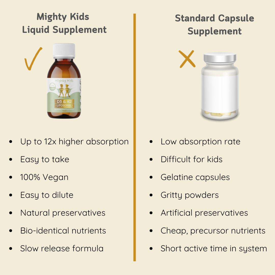 *Studies (such as this one) have shown that the liposomes used in Mighty Kids supplements provide at least 12 times greater absorption compared to ordinary, non-liposomal supplements.